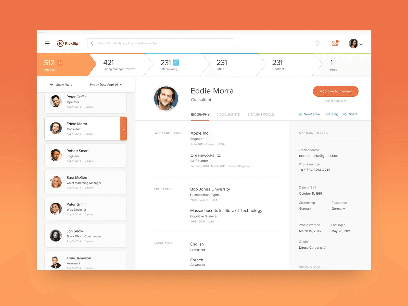 A talent pipeline design for a cloud-based human resource management solution. The platform improves control of content, talent, and vacancies through intuitive data representation. We needed to achieve a fine balance between a look that communicates technology and simplicity, but also conveys a playful and friendly feeling.